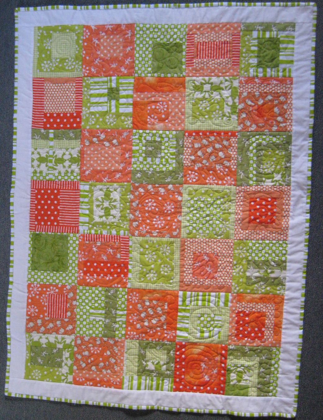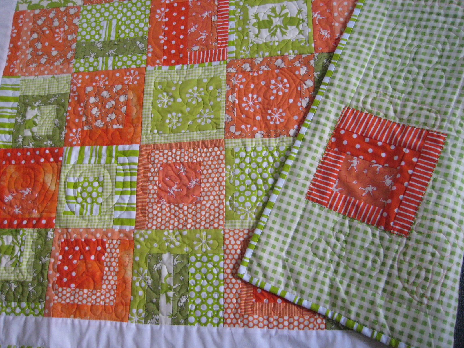 Absolutely beautiful! I love the girly-ness of your personal quilt – and the 2 sides compliment each other – one very ordered and the other a bit crazy. The oranges and limes quilt looks very fresh and “zingy”!