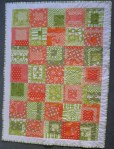 Oranges and Limes – a quilt for a friend. Every square is different – I started with a shape and added strips until it reached the size I wanted. I spent a wet, cold week in July making the squares for this quilt – I spread the fabric out over the table at my Mother’s and played.