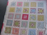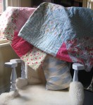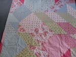 I have not done much creating with fabric this year – too many other things have filled my time. The other quilt that I completed a while back is for me – a little indulgence. It has been sitting on my rocking chair for about three months and I have used it to snuggle under while watching DVDs or TV. I just took a photo of it then and both my boys looked at it in amazement – as if they had never seen it before. They wanted to know who it was for and why they hadn’t seen it before – well, they sit next to the rocking chair every day, so I can’t answer that question – perhaps they are not good at noticing things like this unless pointed out. I love the pastel coloured fabrics – they are soft and pretty. I used up left over bits to create the back – I played with giant triangles – it was like doing geometry all over again – in fact, I like the back more than the front. I was inspired by a friend from my past who is a very very talented and gifted quilter and gardener to use this pattern. If you enjoy quilts and gardens, you will love her blog and her work. Here is my quilt: