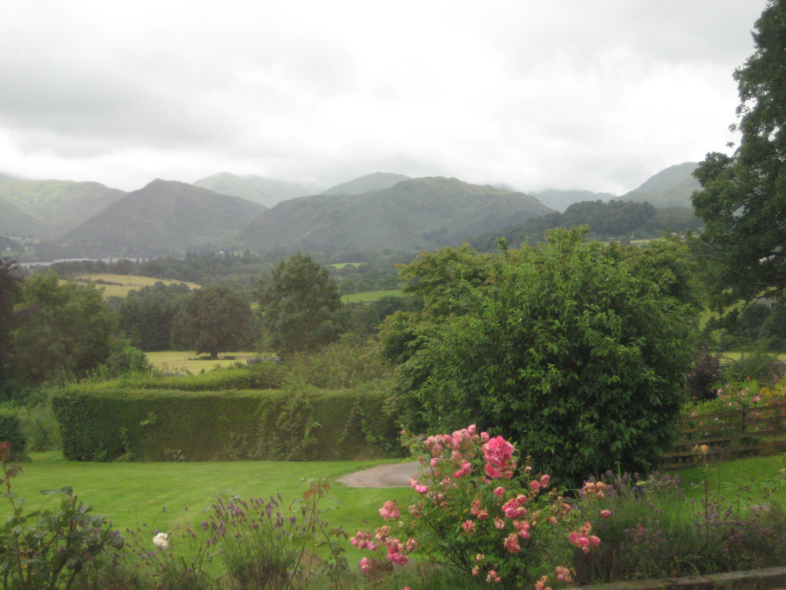 We were heading for the Ullswater Lake in the Northern Lakes District to stay in a place called Watermillock. It pulsed as we drove up the Motorway and the landscape changed from misty invisibility to vivid hills and dales and glorious colour. I chose this place on a whim – there was a window seat with a view and it is a breathtakingly glorious view, even when the weather pulses. It constantly changes. We can see the long narrow lake – it reminds me of the lake where the Swallows and Amazons is based – I can imagine the little sailing boats scuttling down the lake with hills on each side and tiny villages tucked in sheltered coves.