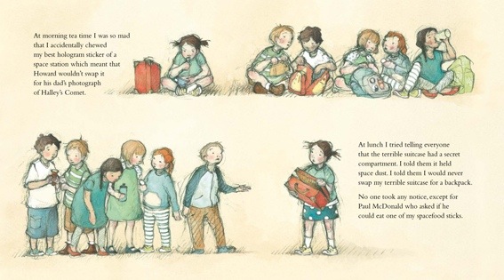I am sure that he thought his lunch box was “the terrible lunch box”, I don’t remember. However, I am sure there were moments as he adjusted to the new routines of school that were terribly bad and I wasn’t there to rescue him or make things better. A new book has recently been published about a little girl who is about to start school and it is written by an old friend of mine who I knew when she was a uni student. It is called “The Terrible Suitcase“. It is about a little girl who gets given a “terrible suitcase” for her going-to-school present instead of the red backpack with yellow rockets and a silver zipper. And she was mad. Very mad.